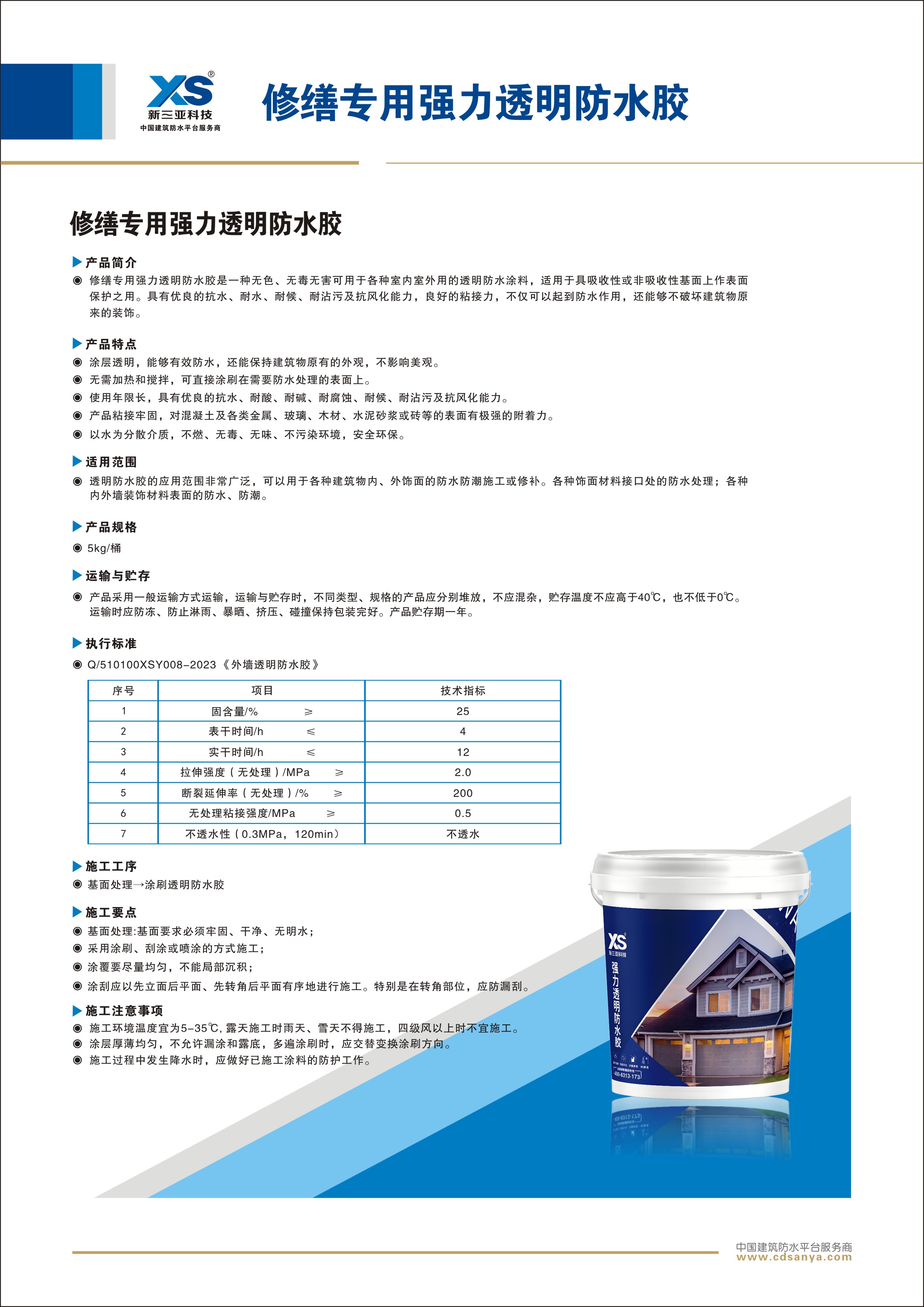 產(chǎn)品簡介: 修繕專用強力透明防水膠是一種無色、無毒無害可用于各種室內(nèi)室外用的透明防水涂料,適用于具吸收性或非吸收性基面上作表面保護(hù)之用。具有優(yōu)良的抗水、耐水、耐候、耐沾污及抗風(fēng)化能力,良好的粘接力,不僅可以起到防水作用,還能夠不破壞建筑物原來的裝飾。 規(guī)格:5kg/桶